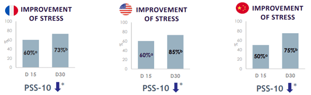 En effet, le score du questionnaire PSS-10 a diminué dans chaque zone géographique (comparé au score du questionnaire réalisé avant l’étude). Ce qui montre bien une amélioration du bien-être général et de la gestion du stress. Les effets de Lactium® sont notables à partir de de 15 jours mais sont d’autant plus significatifs au bout de 30 jours de supplémentation.